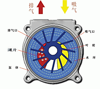 當泵體中裝有適量的水作為工作液。當葉輪按順時針方向旋轉時,水被葉輪拋向四周,由于離心力的作用,水形成了一個決定于泵腔形狀的近似于等厚度的封閉圓環。水環的下部分內表面恰好與葉輪輪轂相切,水環的上部內表面剛好與葉片頂端(實際上葉片在水環內有定的插入深度)。此時葉輪輪轂與水環之間形成一個月牙空間,而這一空間又被葉輪分成和葉片數目相等的若干個小腔。如果以葉輪的下部零為起點,那么葉輪在旋轉前180度時,小腔面積由小變大,且與端面上的吸氣口相通,此時氣體被吸入,當吸氣終了時小腔則與吸氣口隔絕;當葉輪繼續旋轉時,小腔由大變小,使氣體被壓縮;當小腔與排氣口相通時,氣體便被排出泵外。