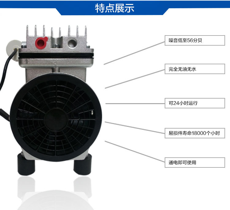 無油真空泵是一種無需任何油作潤滑既能運轉工作的機械真空泵。它具有結構簡單、操作容易、維護方便、不會污染環境等優點。無油真空泵耐用性好,是抽真空,壓縮,兩用真空泵,是一種應用范圍非常廣泛獲得真空的基本設備。